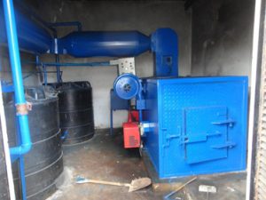 High-Efficiency & Heavy Duty Industrial BurnersThe burners installed in our system are of heavy duty industrial type, capable of raising the temperature in the chamber to the required level in a very short time (15 minutes).The burners use diesel oil as an auxiliary fuel, and when the temperature reached optimum, the photo-sensor cuts off fuel supply, thus saving on fuel oil consumption. However, it restarts automatically if the temperature falls down again. Depending on chamber size, a secondary chamber can be provided, which receives flue gas from the primary chamber and completes the combustion process, leading to cleaner flue gas. However, the heat from the secondary chamber adds up the exit heat, leading to requirements for heavy duty cooling, and hence, faster generation of hot water. |
